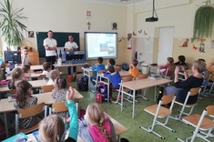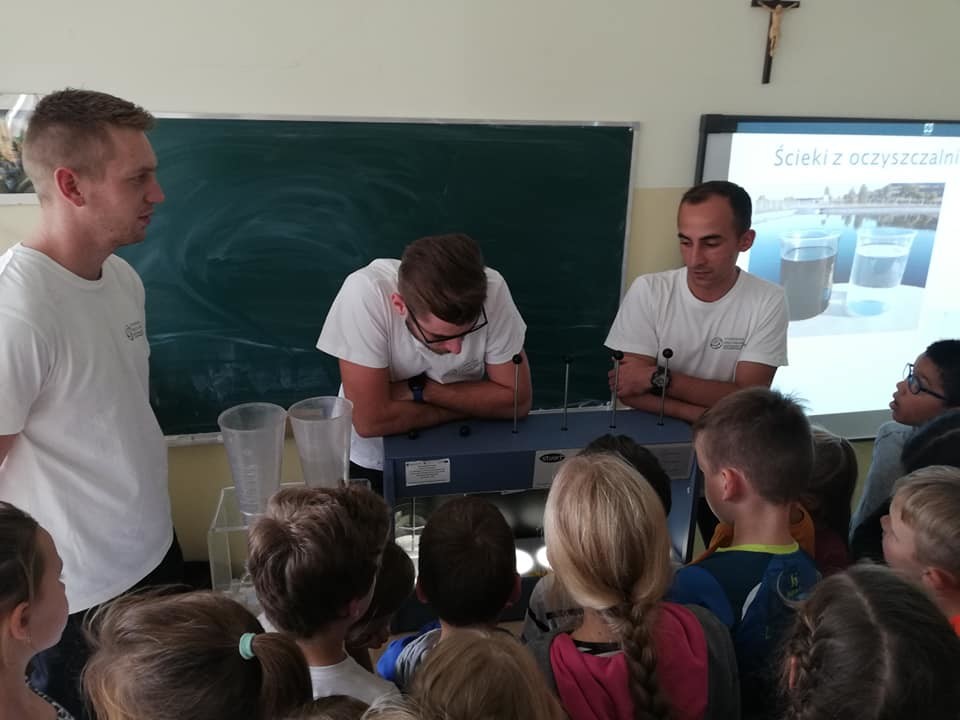 Studenci przybliżyli uczniom problematykę oszczędzania wody. Dzieci i młodzież dowiedziała się w jaki sposób woda krąży w przyrodzie, jak pracują wodociągi, kanalizacja, oczyszczalnie ścieków. Ciekawa prezentacja i filmiki prezentowały drogę wody z kranu przez kanalizację, do oczyszczalni ścieków i dopiero do rzeki. Uczniowie, szczególnie najmłodsi z dużym zainteresowaniem przyglądali się prezentacji i z zaciekawieniem obserwowali przeprowadzane doświadczenia, w których mogli asystować. Oddzielanie zanieczyszczeń i filtrowanie wody okazały się najciekawsze.